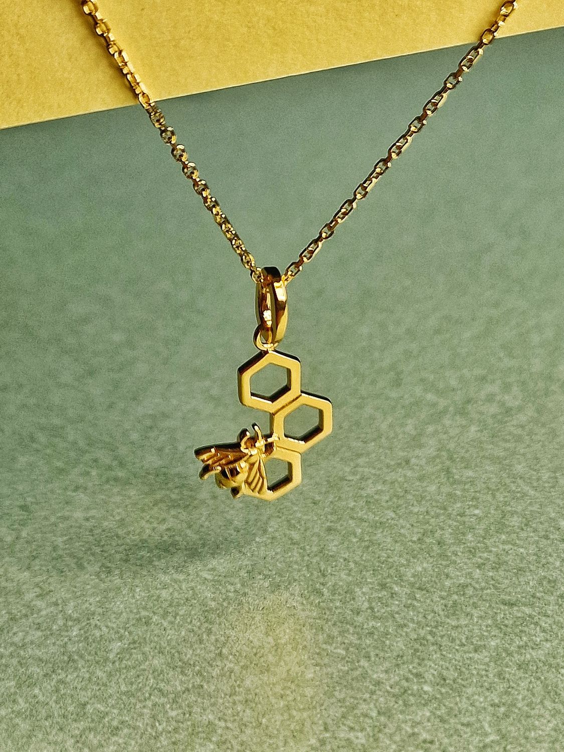 This beautiful gold bumblebee necklace is intricately crafted to bring a timeless piece of the British countryside to your wardrobe. The necklace features a golden bumblebee on a honeycomb, perfect for adding a touch of nature to your look.