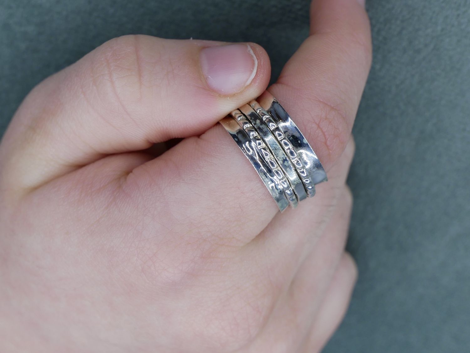 This handcrafted spinner ring is thoughtfully designed to support sensory regulation, providing a stylish and engaging way to stim. It features three freely rotating bands that glide smoothly around the ring, offering a satisfying and grounding sensory experience. Two of the bands have textured surfaces for deep pressure input, while the third is smooth, allowing for varied tactile feedback. Whether used for focus, self-regulation, or simple comfort, this ring is a beautifully functional piece that embraces and celebrates neurodivergent needs.